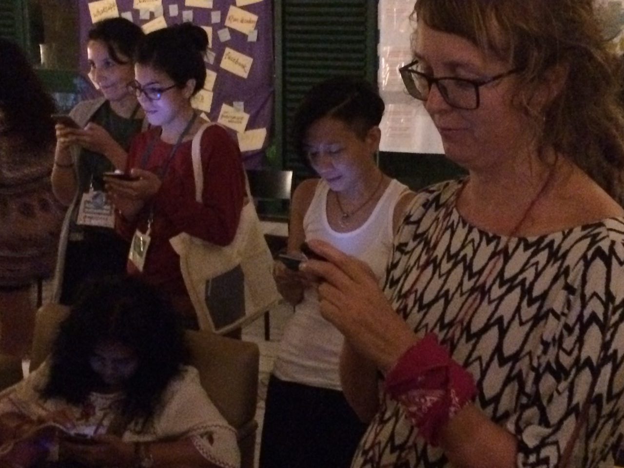 Women engage in autonymous, anonymous public sexting at the Feminist eXchange Hub at the 2016 AWID Forum. This image was shared as part of 16 Days campaign action (2016) sharing photos of women and girls using tech.