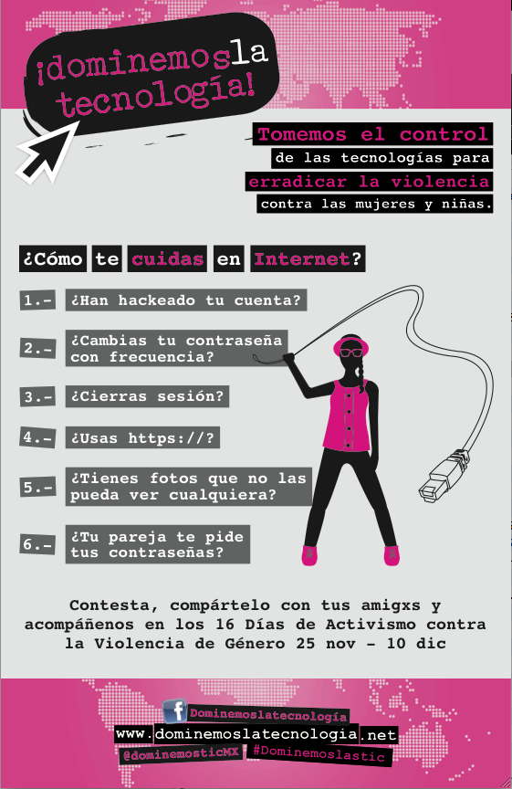 Volante para campaña 2013 en México, promoviendo contactos en FB y Twitter de campaña en América Latina. Mexico campaign flyer used at info fairs, schools, etc. Has questions like Do you log out? Use https? Does your partner ask for your password? and Latin American campaign info.