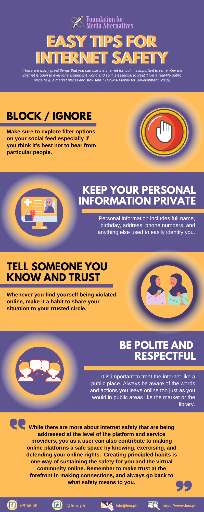 While there are more about Internet safety that are being addressed at the level of the platform and service providers, you as a user can also contribute to making online platforms a safe space by knowing, exercising, and defending your online rights. Creating principled habits is one way of sustaining the safety for you and the virtual community online. Remember to make trust at the forefront in making connections, and always go back to what safety means to you.