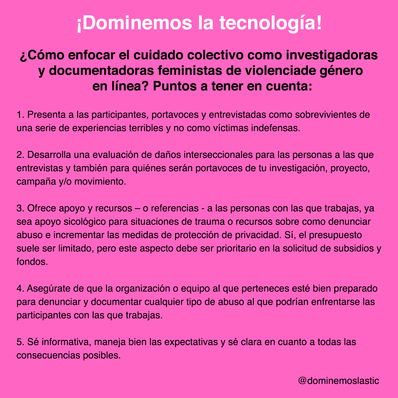 Al inicio de un nuevo año de #metoo y otros poderosos movimientos testimoniales como #survivingRKelly, el conocimiento compartido en enero en el webinar (seminario web) de ¡Dominemos la Tecnología! constituyó una importante oportunidad de aprendizaje, además de un recordatorio de cómo contribuir al bienestar y al cuidado colectivo de nuestro movimiento.