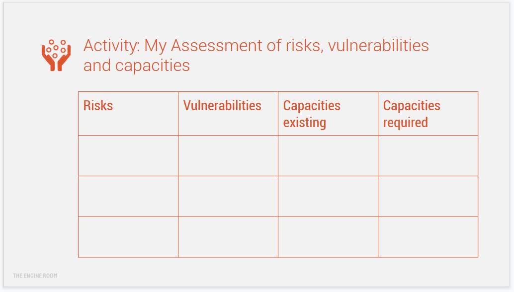 Ainsi, le 21 novembre 2019, Paola Mosso et Barbara Paes, de chez Engine Room, nous ont partagé leurs savoirs sur l’évaluation des risques. Si vous ne connaissez pas l’Engine Room, c’est une organisation internationale qui appuie des militant.e.s et organisations au niveau de leurs données et de la technologie dans une optique de changement social.