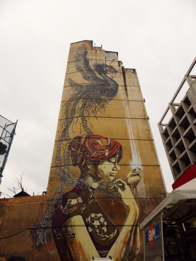 In 2011 the Face Art Public Mural Project commissioned wall art during the 15th Biennial of Young Artists in Thessaloniki, Greece. This piece on the theme of violence against women is by Chinese street artist DALeast and South African street artist Faith47.